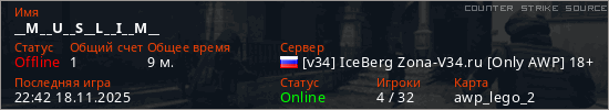 Играет на Counter Strike Source сервере. Страна: РоссияПервый раз замечен 16:25 14.11.2025
