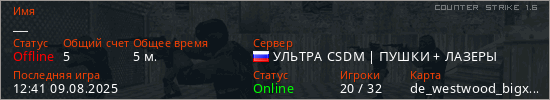 Играет на Counter Strike 1.6 сервере. Страна: РоссияПервый раз замечен 12:37 09.08.2025