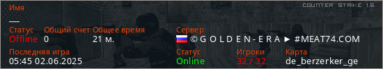 Играет на Counter Strike 1.6 сервере. Страна: РоссияПервый раз замечен 09:23 29.06.2024