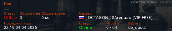 Играет на Counter Strike Source сервере. Страна: РоссияПервый раз замечен 22:17 04.04.2026