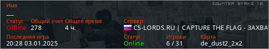 Последний раз был в сети 20:28 03.01.2025 Игрок с таким ником замечен на 33 серверах