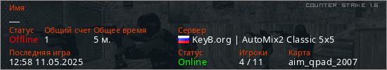 Играет на Counter Strike 1.6 сервере. Страна: РоссияПервый раз замечен 12:54 11.05.2025