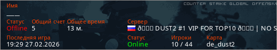 Играет на Counter Strike Global Offensive сервере. Страна: РоссияПервый раз замечен 18:30 27.02.2026