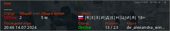 Играет на Counter Strike 1.6 сервере. Страна: РоссияПервый раз замечен 20:32 14.07.2024
