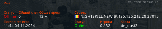 Последний раз был в сети 11:44 04.11.2024 Игрок с таким ником замечен на 32 серверах