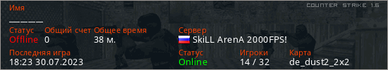 Играет на Counter Strike 1.6 сервере. Страна: РоссияПервый раз замечен 17:15 30.07.2023