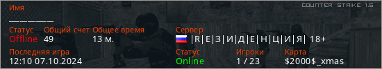 Играет на Counter Strike 1.6 сервере. Страна: РоссияПервый раз замечен 19:58 01.02.2024
