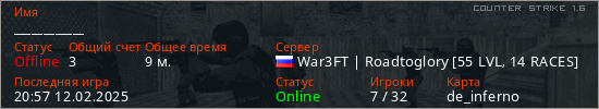Играет на Counter Strike 1.6 сервере. Страна: РоссияПервый раз замечен 22:21 17.02.2024