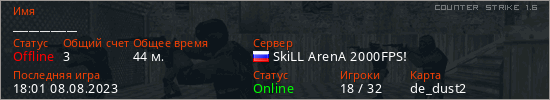 Играет на Counter Strike 1.6 сервере. Страна: РоссияПервый раз замечен 18:42 16.08.2022