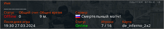 Играет на Counter Strike 1.6 сервере. Страна: РоссияПервый раз замечен 14:16 18.03.2024