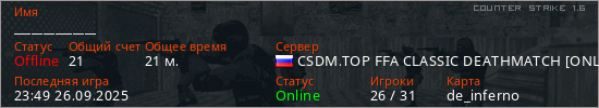 Последний раз был в сети 23:49 26.09.2025 Игрок с таким ником замечен на 15 серверах