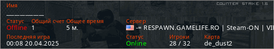 Играет на Counter Strike 1.6 сервере. Страна: СШАПервый раз замечен 00:04 20.04.2025