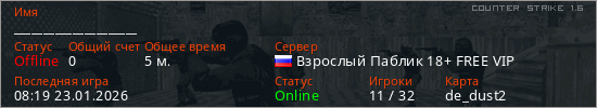Играет на Counter Strike 1.6 сервере. Страна: РоссияПервый раз замечен 08:12 23.01.2026
