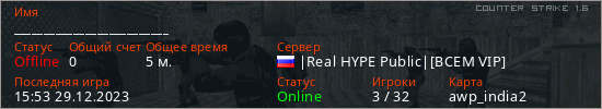 Играет на Counter Strike 1.6 сервере. Страна: РоссияПервый раз замечен 15:51 29.12.2023