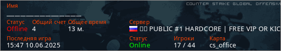 Играет на Counter Strike Global Offensive сервере. Страна: РоссияПервый раз замечен 16:58 05.06.2025
