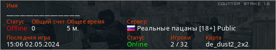 Играет на Counter Strike 1.6 сервере. Страна: РоссияПервый раз замечен 14:41 02.05.2024