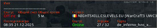 Последний раз был в сети 08:35 21.12.2025 Игрок с таким ником замечен на 12 серверах