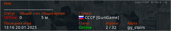 Играет на Counter Strike 1.6 сервере. Страна: РоссияПервый раз замечен 13:14 20.01.2025