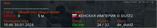Играет на Counter Strike 1.6 сервере. Страна: РоссияПервый раз замечен 10:41 30.01.2026