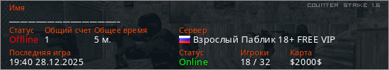 Играет на Counter Strike 1.6 сервере. Страна: РоссияПервый раз замечен 19:30 28.12.2025