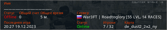 Играет на Counter Strike 1.6 сервере. Страна: РоссияПервый раз замечен 20:25 19.12.2023