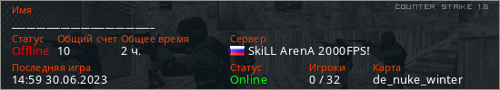 Играет на Counter Strike 1.6 сервере. Страна: РоссияПервый раз замечен 18:17 24.06.2023