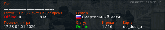 Играет на Counter Strike 1.6 сервере. Страна: РоссияПервый раз замечен 18:25 02.01.2026