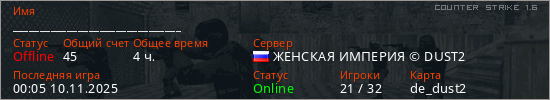 Последний раз был в сети 00:05 10.11.2025 Игрок с таким ником замечен на 31 сервере