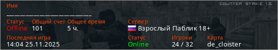 Последний раз был в сети 14:04 25.11.2025 Игрок с таким ником замечен на 31 сервере