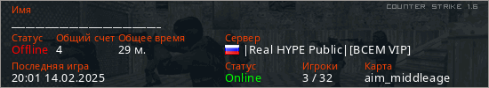Играет на Counter Strike 1.6 сервере. Страна: РоссияПервый раз замечен 15:39 29.12.2023