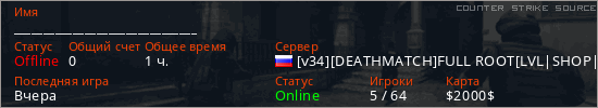 Играет на Counter Strike Source сервере. Страна: РоссияПервый раз замечен 02:43 07.02.2026