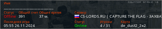 Последний раз был в сети 05:55 26.11.2024 Игрок с таким ником замечен на 31 сервере