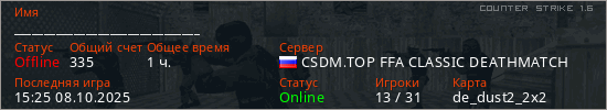 Последний раз был в сети 15:25 08.10.2025 Игрок с таким ником замечен на 31 сервере