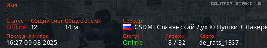 Играет на Counter Strike 1.6 сервере. Страна: РоссияПервый раз замечен 10:11 03.05.2025