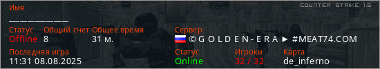 Последний раз был в сети 11:31 08.08.2025 Игрок с таким ником замечен на 13 серверах