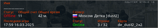 Играет на Counter Strike 1.6 сервере. Страна: РоссияПервый раз замечен 21:00 01.02.2023