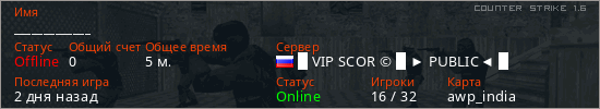 Играет на Counter Strike 1.6 сервере. Страна: РоссияПервый раз замечен 17:52 18.12.2025
