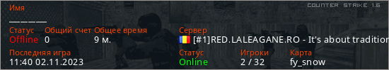 Играет на Counter Strike 1.6 сервере. Страна: РумынияПервый раз замечен 00:44 27.09.2023