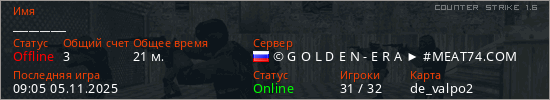 Последний раз был в сети 09:05 05.11.2025 Игрок с таким ником замечен на 21 сервере