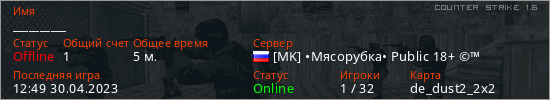 Играет на Counter Strike 1.6 сервере. Страна: РоссияПервый раз замечен 12:45 30.04.2023