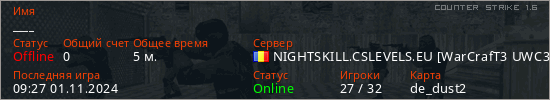 Последний раз был в сети 09:27 01.11.2024 Игрок с таким ником замечен на 32 серверах