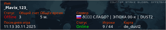 Играет на Counter Strike Global Offensive сервере. Страна: РоссияПервый раз замечен 11:06 30.11.2025