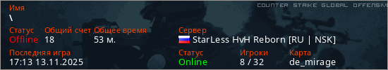 Играет на Counter Strike Global Offensive сервере. Страна: РоссияПервый раз замечен 14:14 05.10.2025