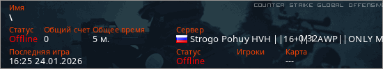 Играет на Counter Strike Global Offensive сервере. Страна: РоссияПервый раз замечен 14:31 24.01.2026