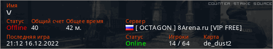 Играет на Counter Strike Source сервере. Страна: РоссияПервый раз замечен 17:52 20.10.2022