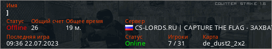 Последний раз был в сети 09:36 22.07.2023 Игрок с таким ником замечен на 22 серверах