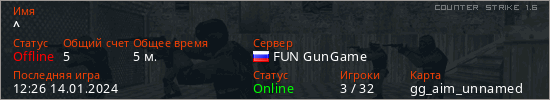 Играет на Counter Strike 1.6 сервере. Страна: РоссияПервый раз замечен 12:24 14.01.2024