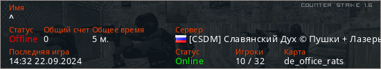 Играет на Counter Strike 1.6 сервере. Страна: РоссияПервый раз замечен 14:27 22.09.2024