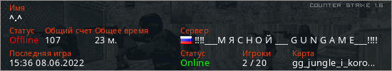 Играет на Counter Strike 1.6 сервере. Страна: РоссияПервый раз замечен 15:15 08.06.2022