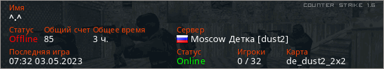 Играет на Counter Strike 1.6 сервере. Страна: РоссияПервый раз замечен 15:48 06.05.2021